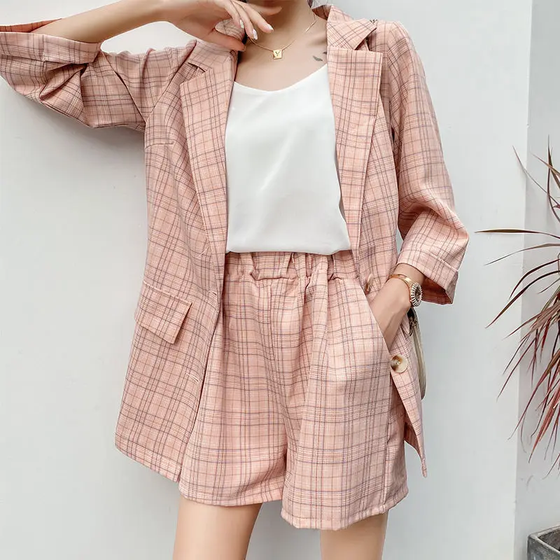 Женский розовый клетчатый костюм DAYIFUN, корейское повседневное пальто и шорты, комплект из двух предметов, весна-лето, профессиональная свободная тонкая женская одежда