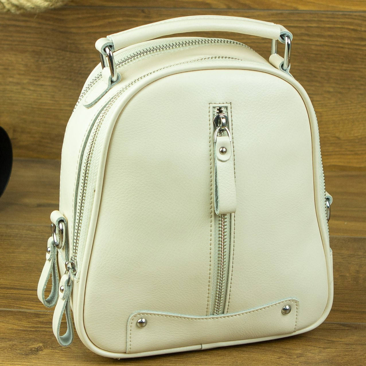 Нежный компактный женский рюкзак из натуральной кожи. Рюкзак имеет два больших отделения на молнии и два дополнительных маленьких отделения (спереди и сзади). Внутри большого отделения имеется потайной карман и маленький карман без застежки. По бокам рюкзака размещены кольца для крепления к ним длинного ремешка, при помощи которого рюкзак легко превращается в сумочку через плече. Дно сумки защищено мелкими металлическими ножками.