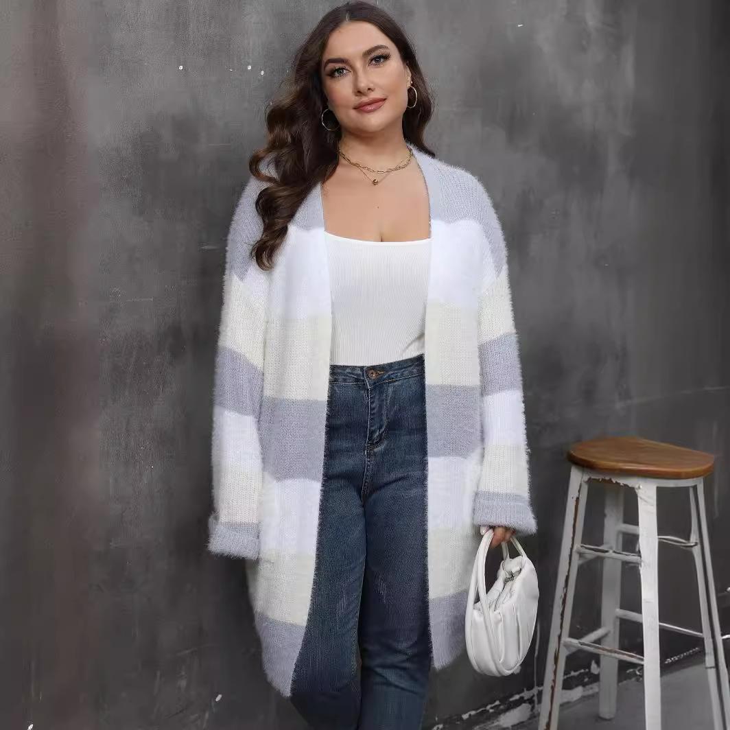 Женский свитер большого размера в полоску с двойным карманом и контрастными цветами, осенне-зимний L серый