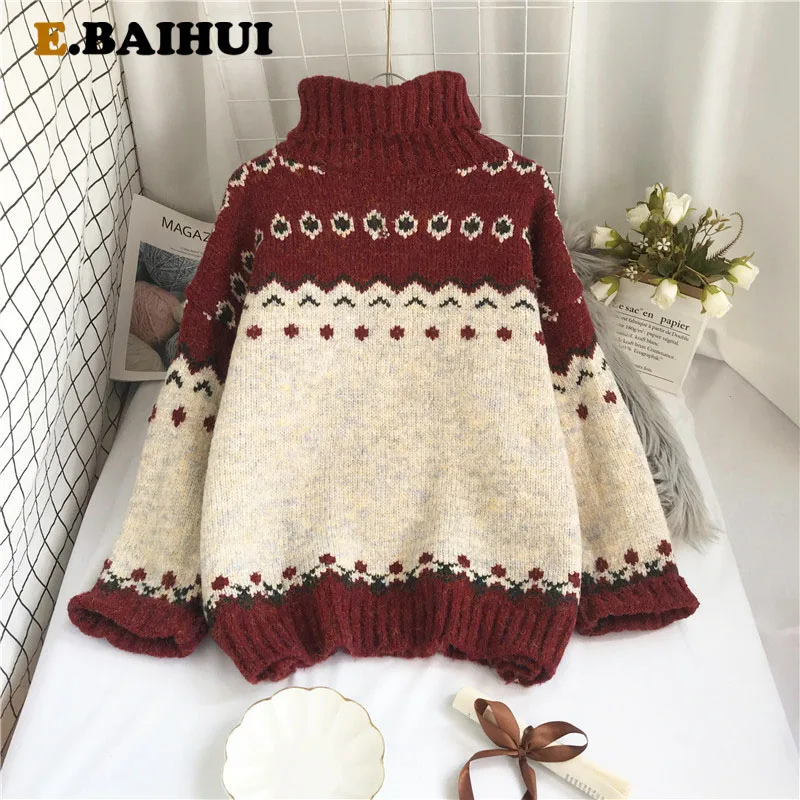 Женский свитер-водолазка EBAIHUI, толстый Свободный пуловер в Корейском стиле, новинка сезона осень-зима 2021, винтажный пуловер с геометрически...