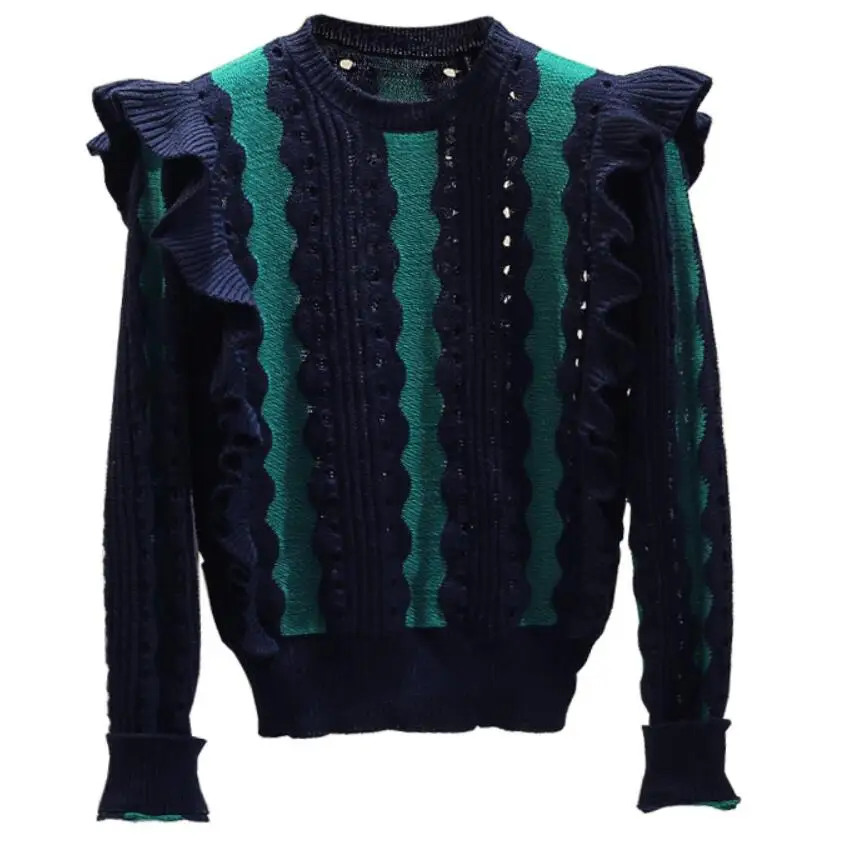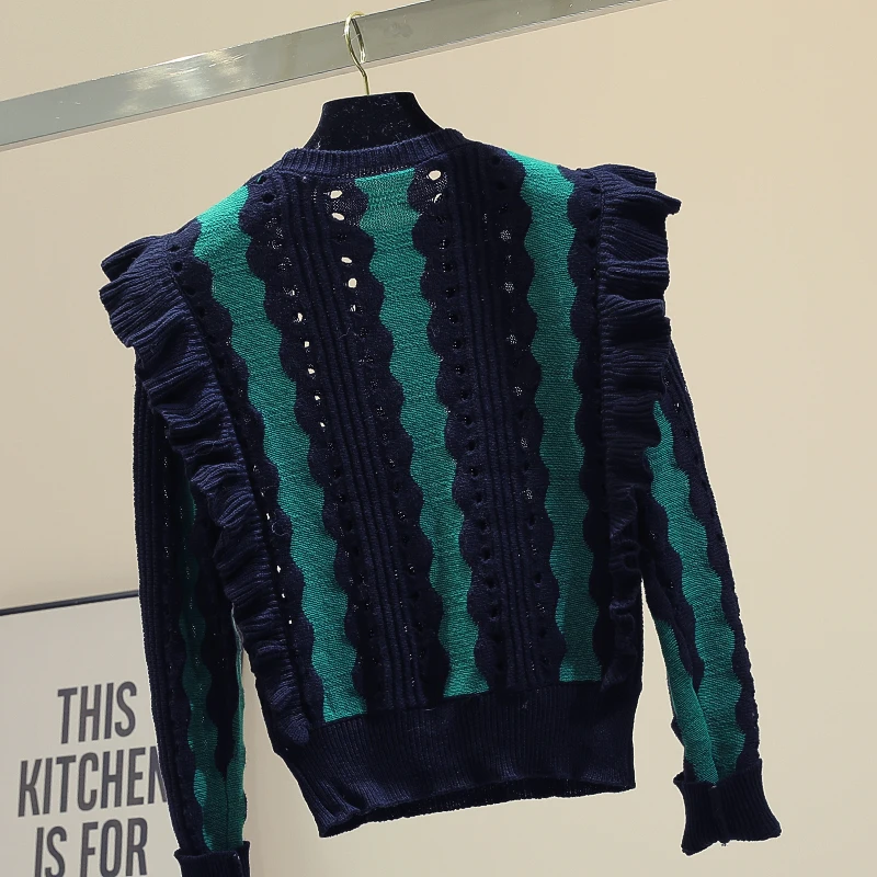 Женский свитер в полоску, свободный свитер с оборками, весна-осень-зима 2021