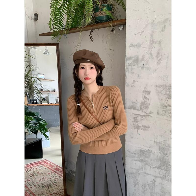 Женский свитер-пуловер с полуоткрытым воротником на молнии, осенне-зимний, новый стиль, нишевый шик, вышитый короткий топ с правым плечом One Size