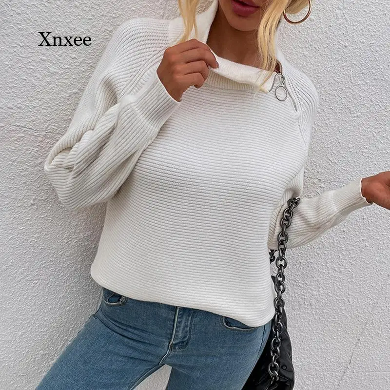Женский свитер с высоким воротником на молнии, Модный повседневный мягкий вязаный свитер, пуловеры, одежда сезона осень 2021, однотонные женс...