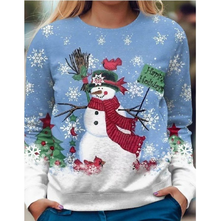 women tops,женский свитшот с круглым вырезом и принтом снеговика в стиле ретро синий