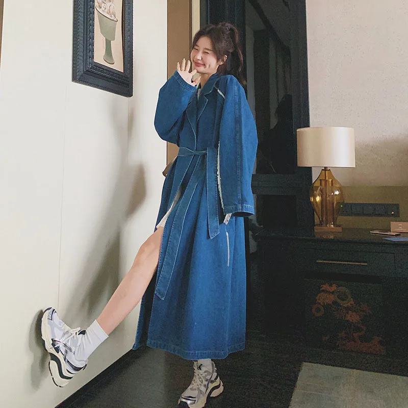 Женский свободный двубортный джинсовый тренчкот средней длины с поясом, весна-осень 2024
