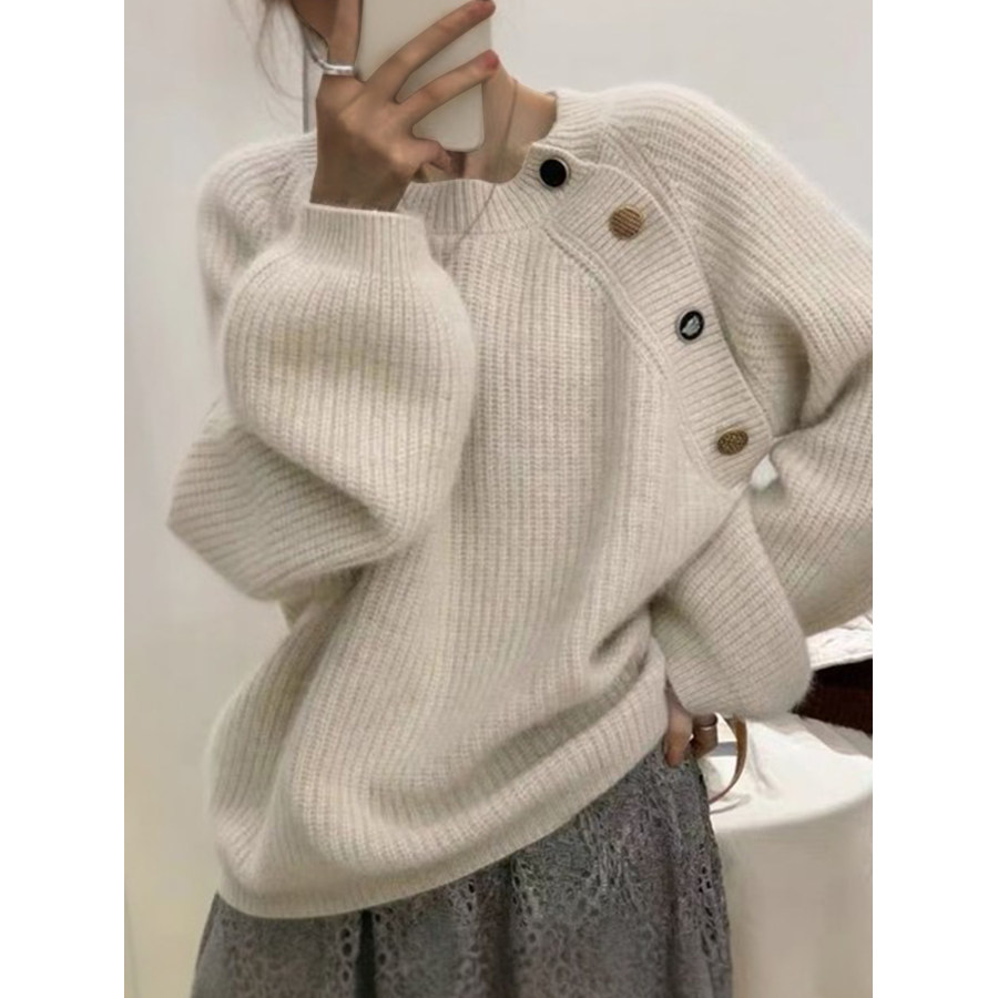women tops,женский свободный свитер с круглым вырезом и пуговицами нестандартной формы