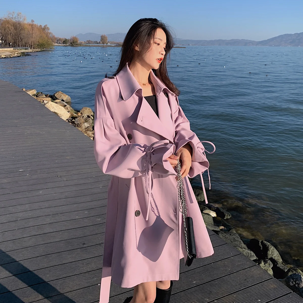 Женский свободный тренчкот средней длины, розовый тренчкот с воротником-стойкой и поясом в уличном стиле, осень 2021