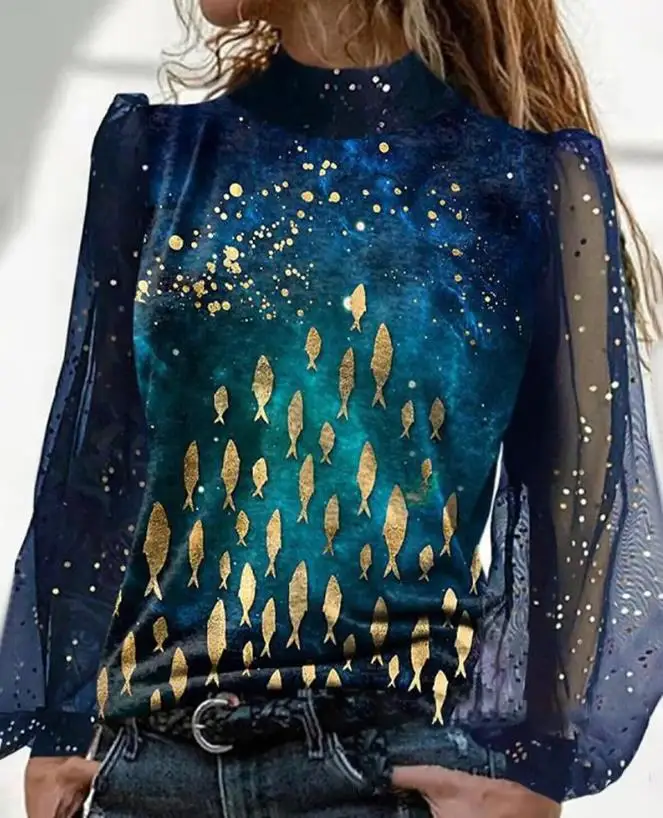 Женский сетчатый топ с длинным рукавом и принтом в виде рыбок
