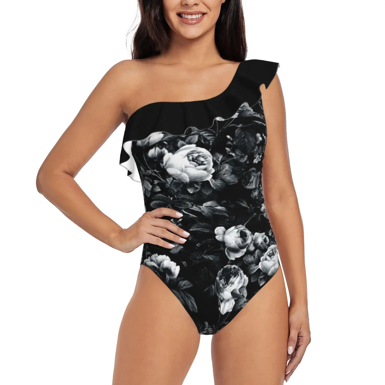 Женский слитный купальник с оборками, черный и белый купальник с цветочным узором