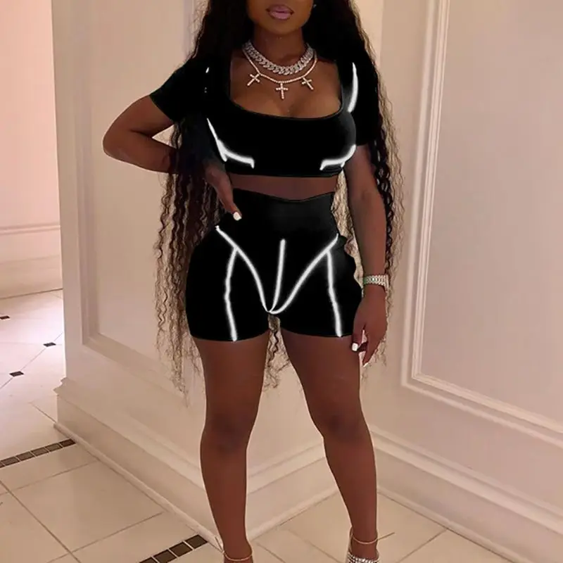 Женский спортивный комплект из 2 предметов, неоновый однотонный укороченный топ с высокой талией и шорты со светоотражающими полосками, обл...