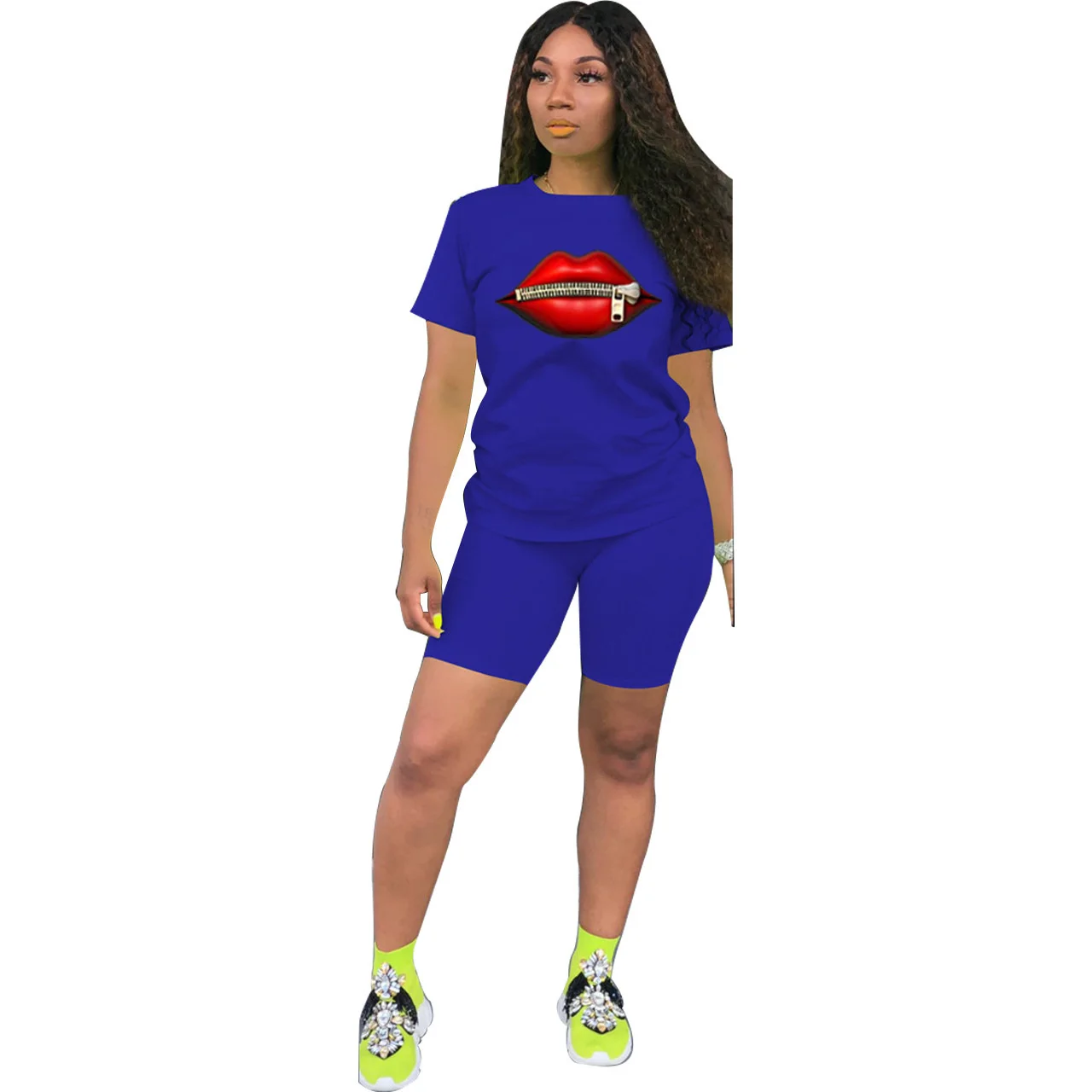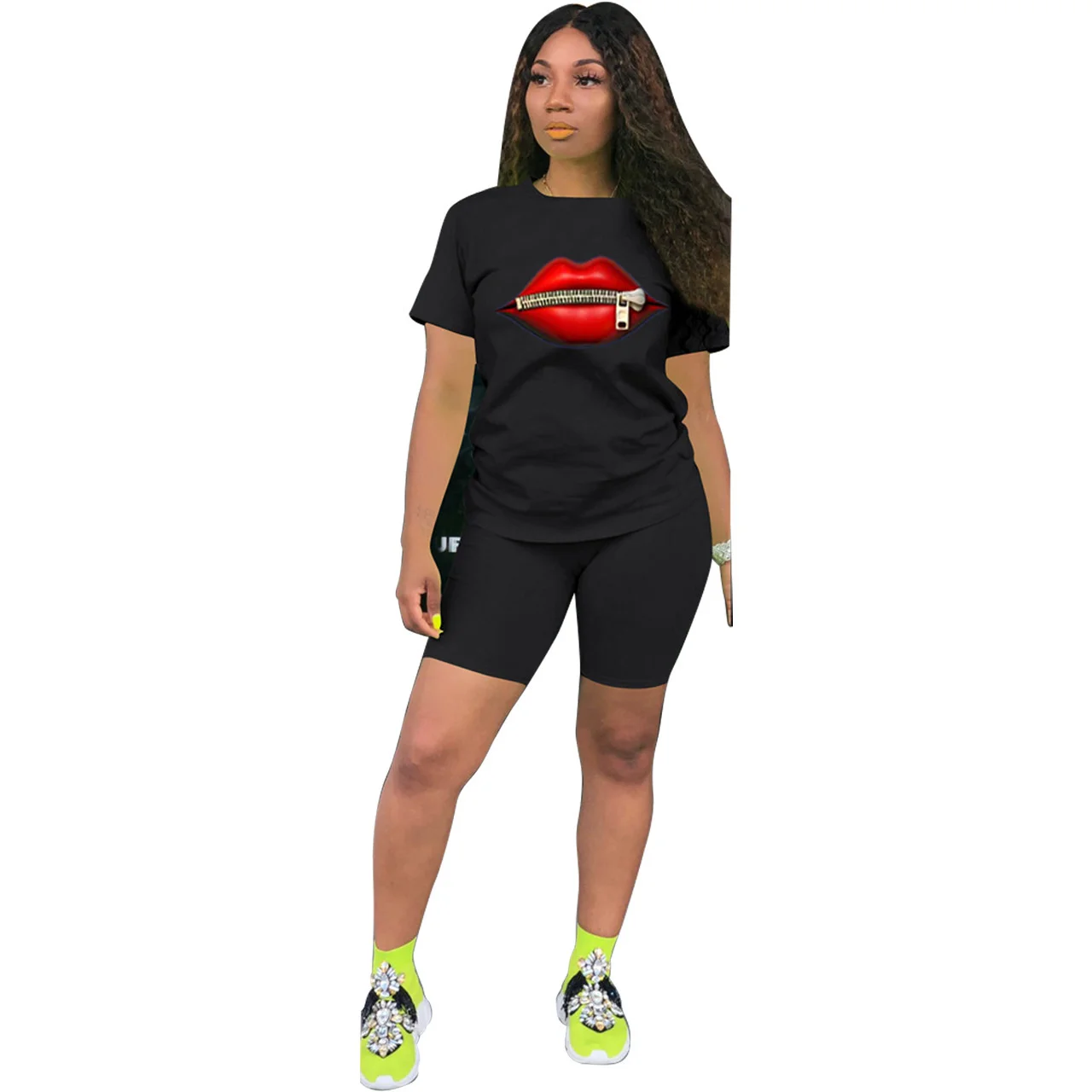 Женский спортивный костюм с коротким рукавом, круглым вырезом и принтом губ