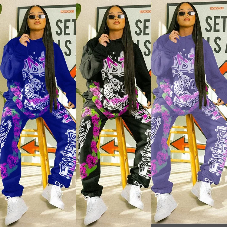 Женский спортивный костюм, черные свободные штаны и толстовка с принтом в стиле граффити
