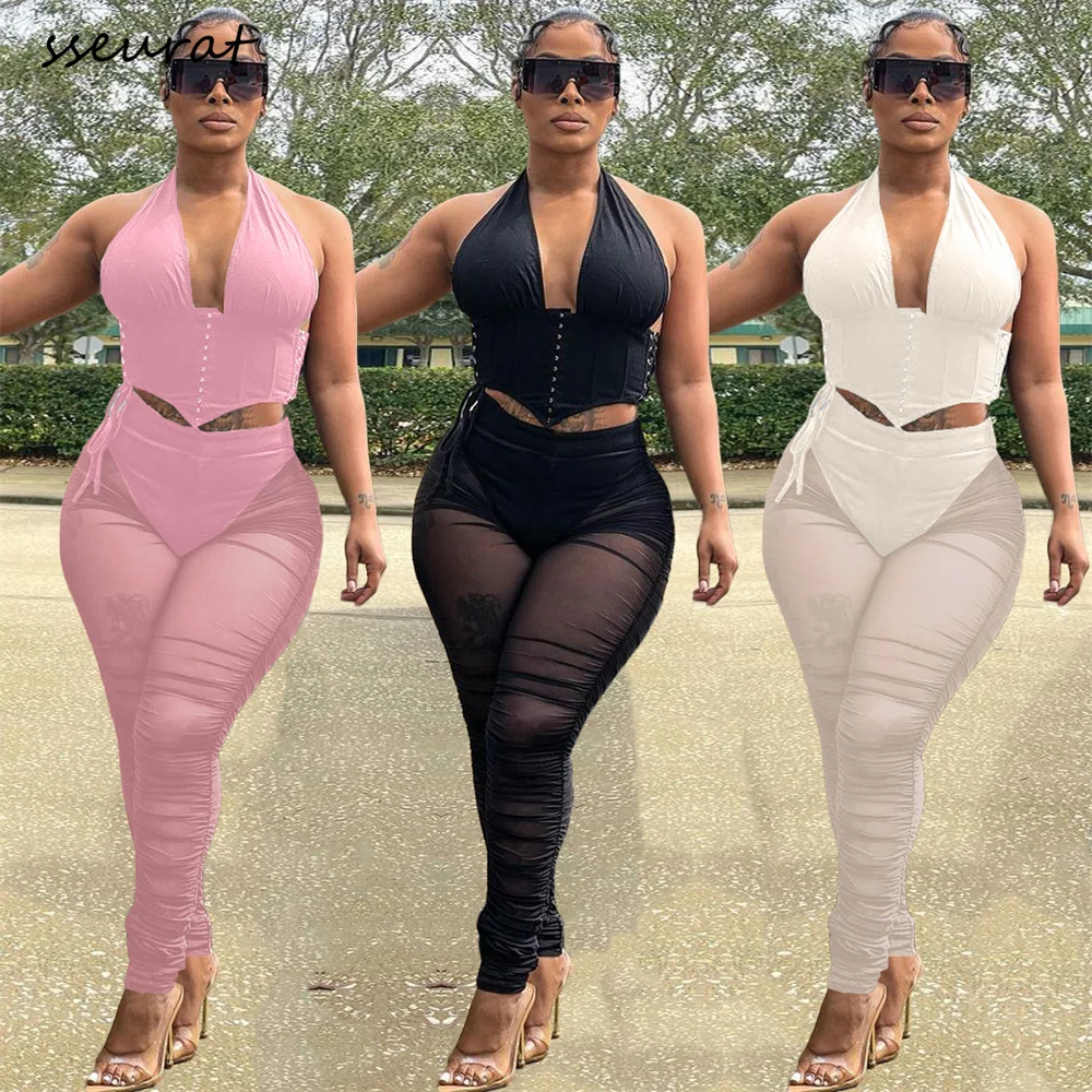 Женский спортивный костюм SSEURAT, комплект из двух предметов, короткий топ с лямкой на шее и леггинсы из сетчатой ткани, лето 2022