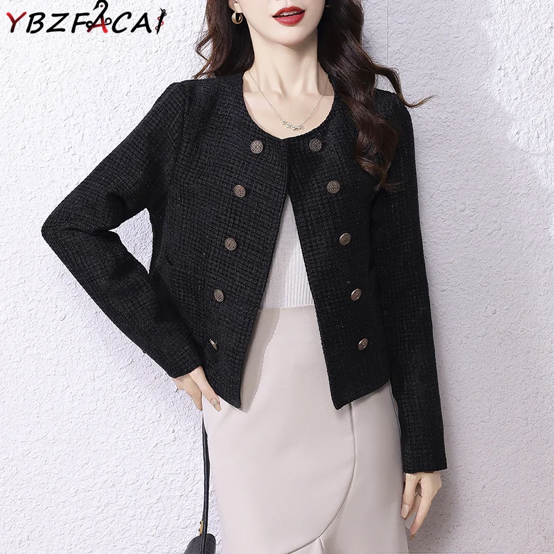 Женский твидовый пиджак, черный двубортный пиджак с круглым вырезом и длинным рукавом, в винтажном стиле, осень 2022