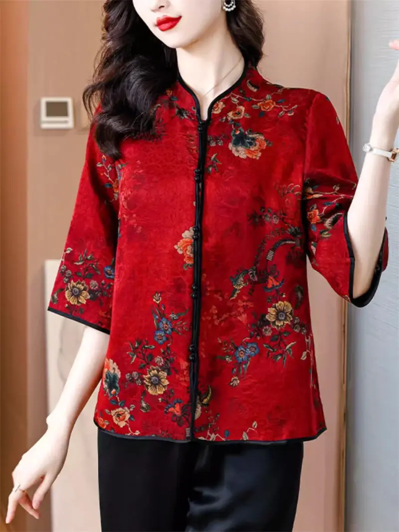 Женский топ для мам Летняя шелковая рубашка для среднего и пожилого возраста 2024 Модная ретро модная блуза с принтом и рукавом 3/4 K1081