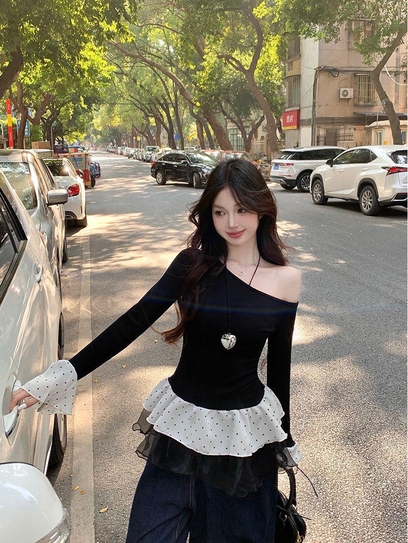 Женский топ на одно плечо из черной сетки в горошек, приталенный, ранняя весна 2025 Large чёрный