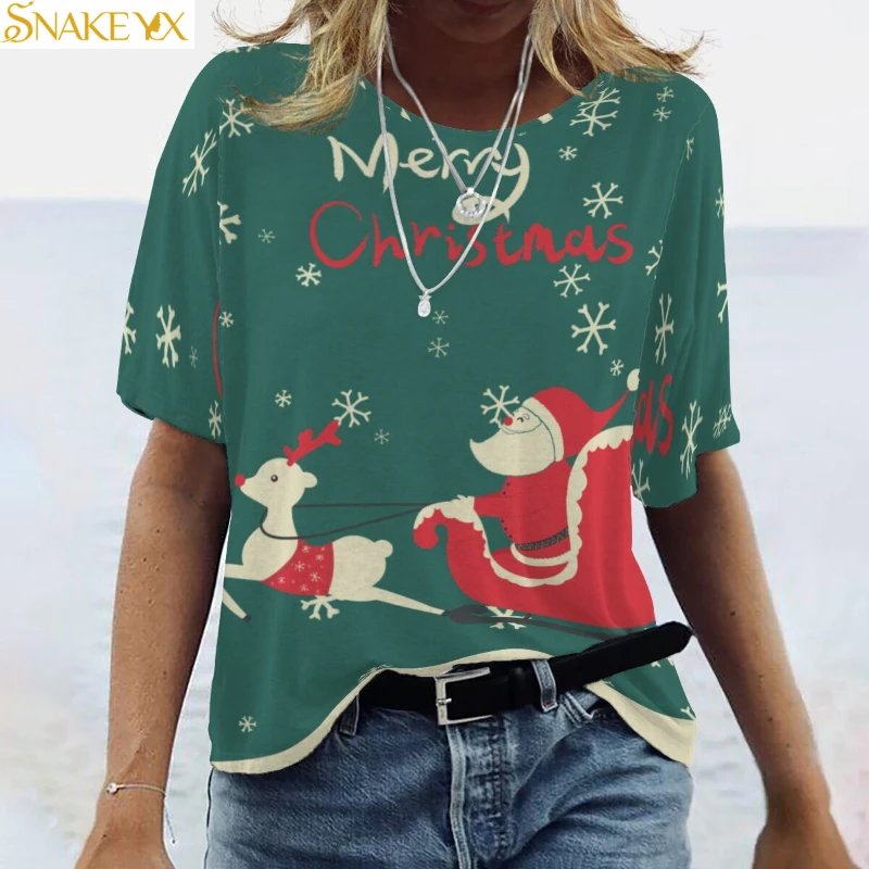Женский топ с коротким рукавом и круглым вырезом, с рождественским принтом
