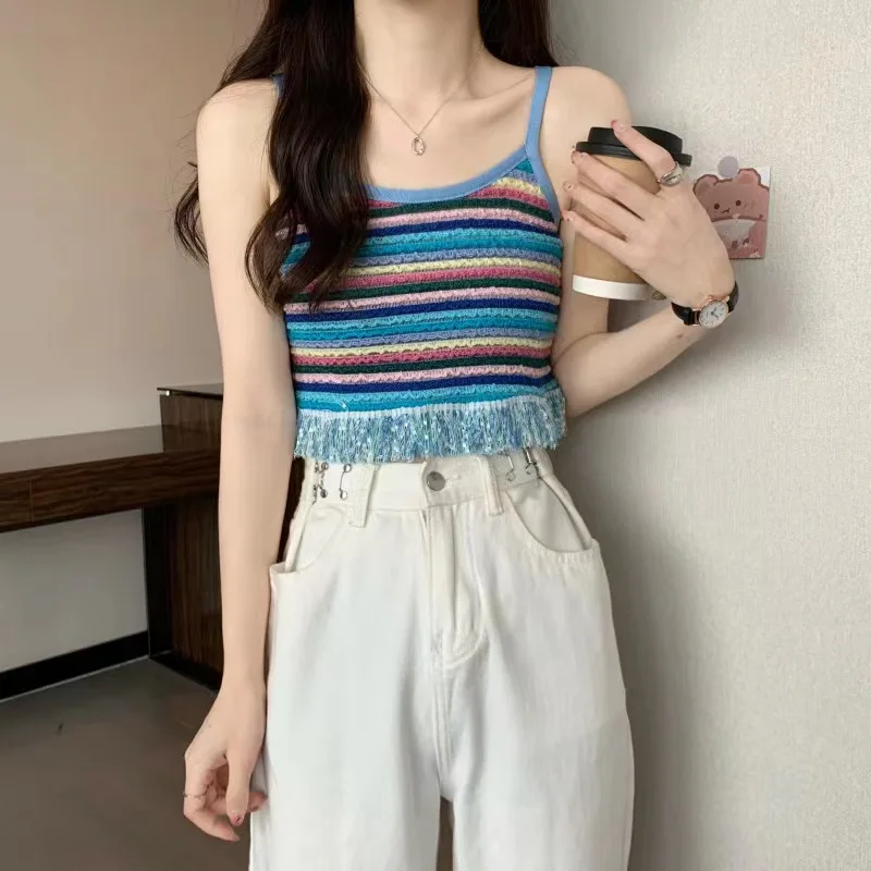Женский трикотажный жилет с открытыми плечами, короткий жилет в полоску с подтяжками, летний сезон 16880304