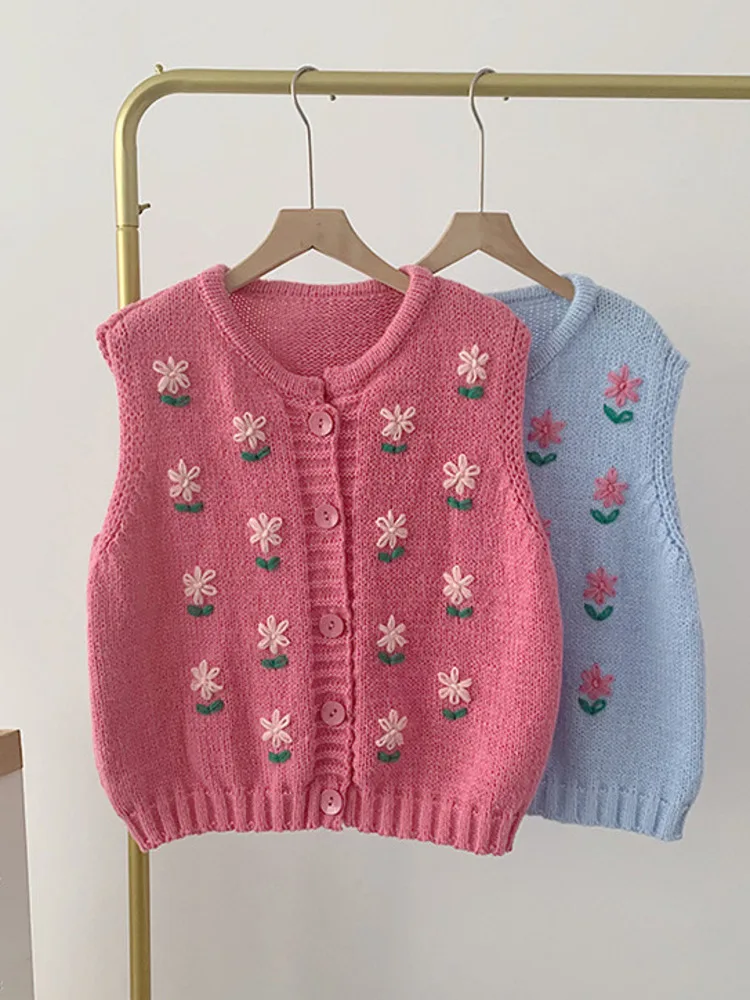 Женский трикотажный жилет с цветочной вышивкой и круглым вырезом