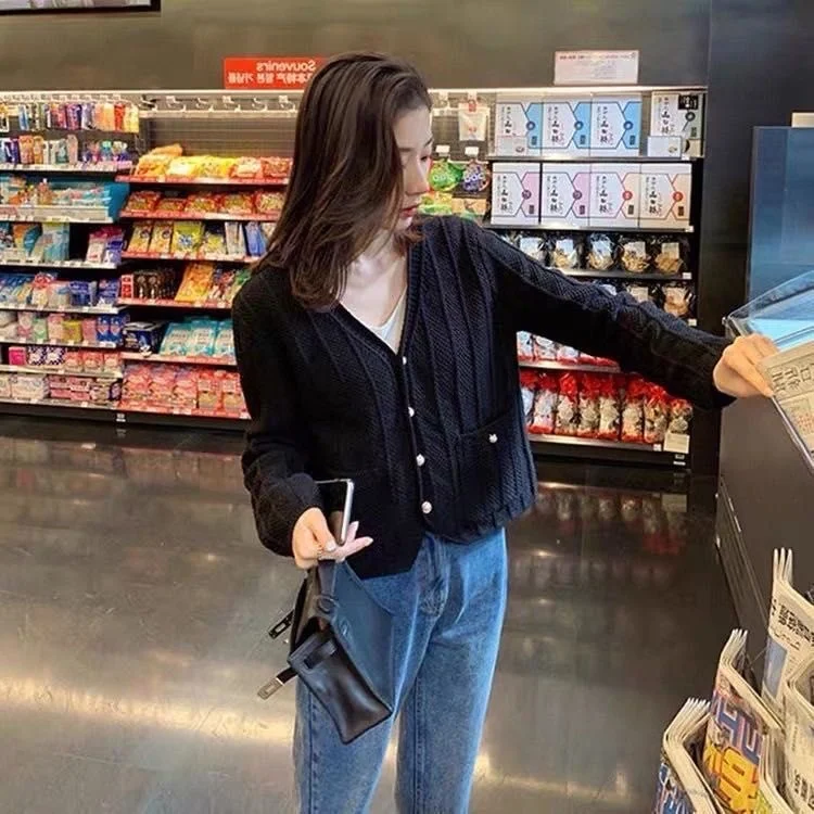 Женский трикотажный кардиган с жемчужной пряжкой и V-образным вырезом, весна 2021