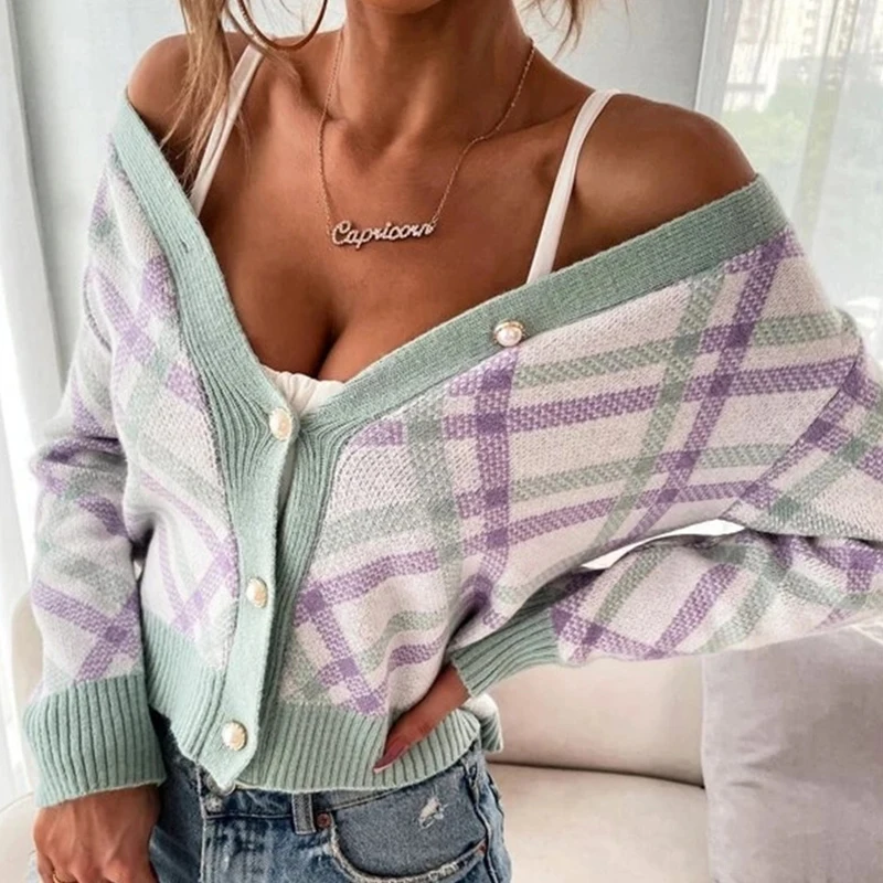 Женский трикотажный кардиган Foridol, Прямой Кардиган на пуговицах с жемчугом, с принтом ромбиками, в английском стиле, Осень-зима короткий сви...