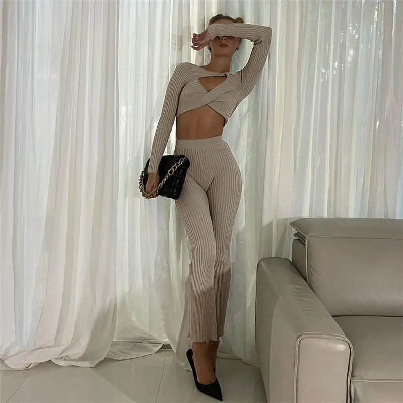 Женский трикотажный комплект из двух предметов, элегантный пикантный комплект из укороченного топа с длинным рукавом и прямых брюк, осень ...