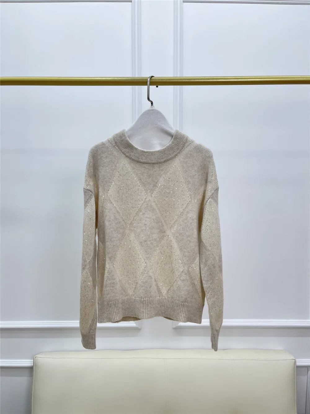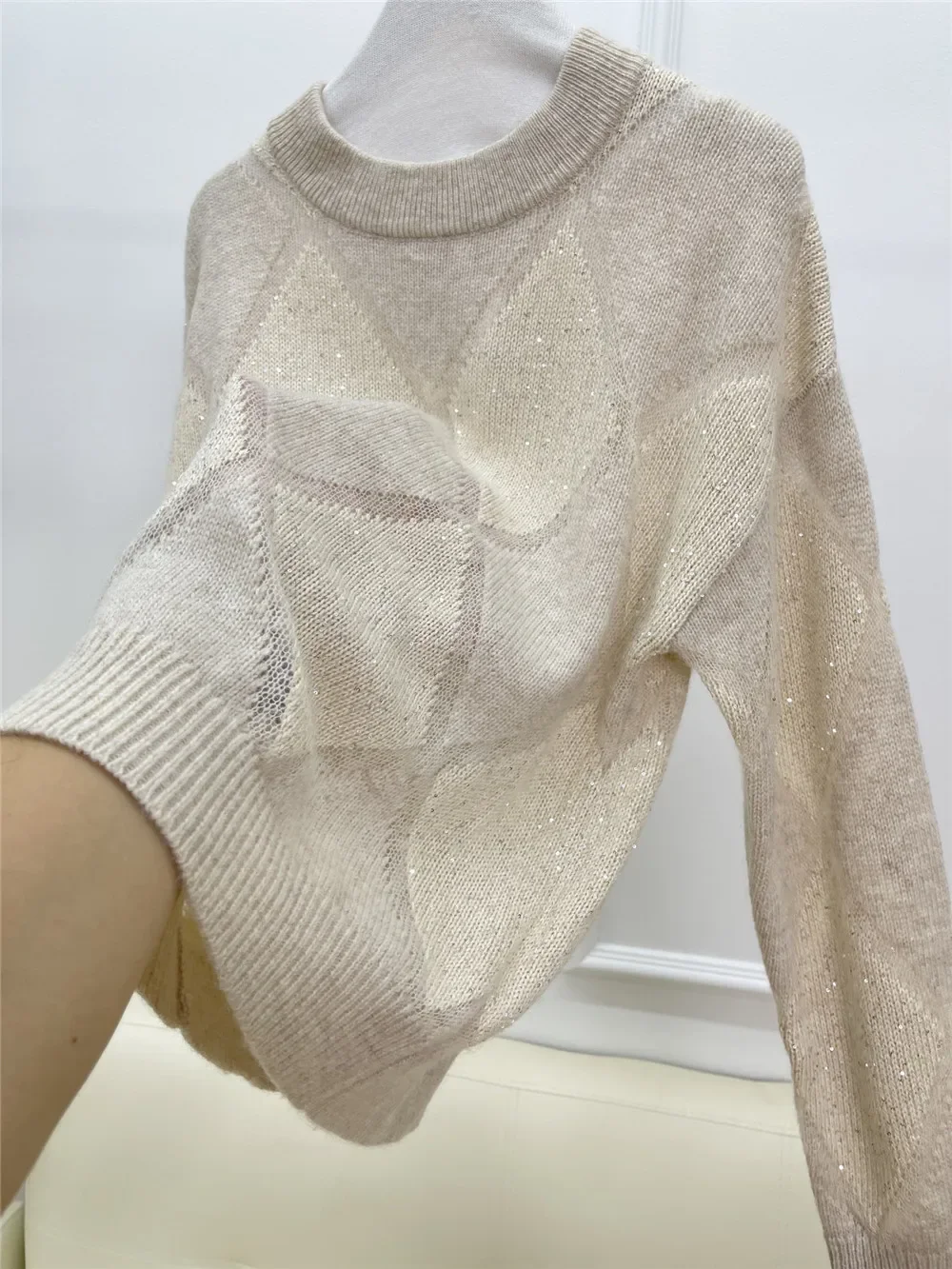 Женский трикотажный пуловер в клетку, с круглым вырезом и длинным рукавом