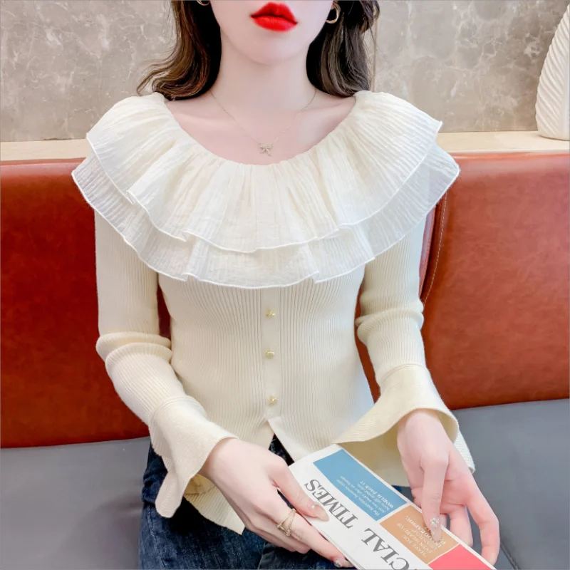 Женский трикотажный пуловер в стиле пэчворк, с двойными оборками и расклешенными рукавами