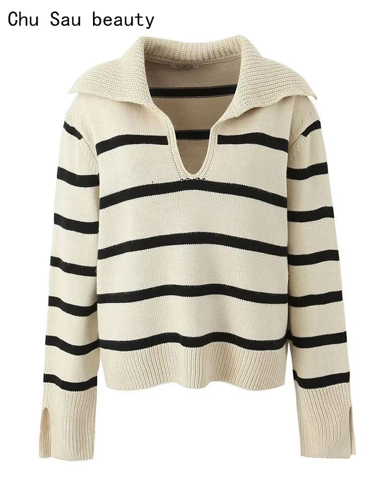 Женский трикотажный пуловер с большим воротником-лацканом, свободный жаккардовый джемпер в полоску, осень 2023