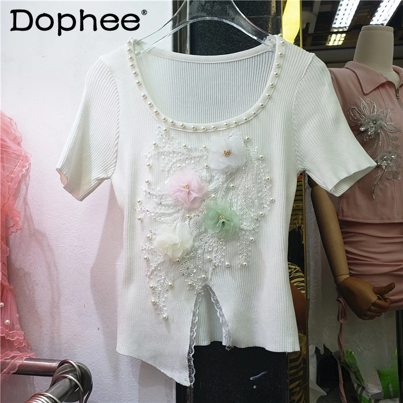 Женский трикотажный пуловер с бусинами, необычный пуловер с трехмерными цветами и разрезом, лето 2022