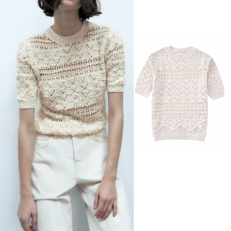Женский трикотажный пуловер с круглым вырезом, бежевый удобный облегающий пуловер, лето 2023