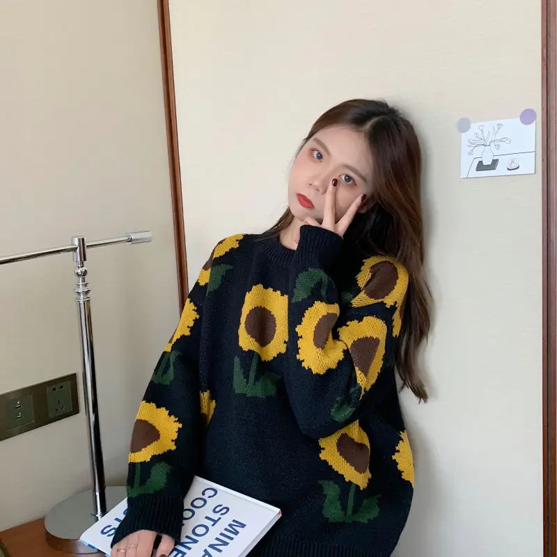 Женский трикотажный пуловер с круглым вырезом, длинным рукавом и цветочным принтом
