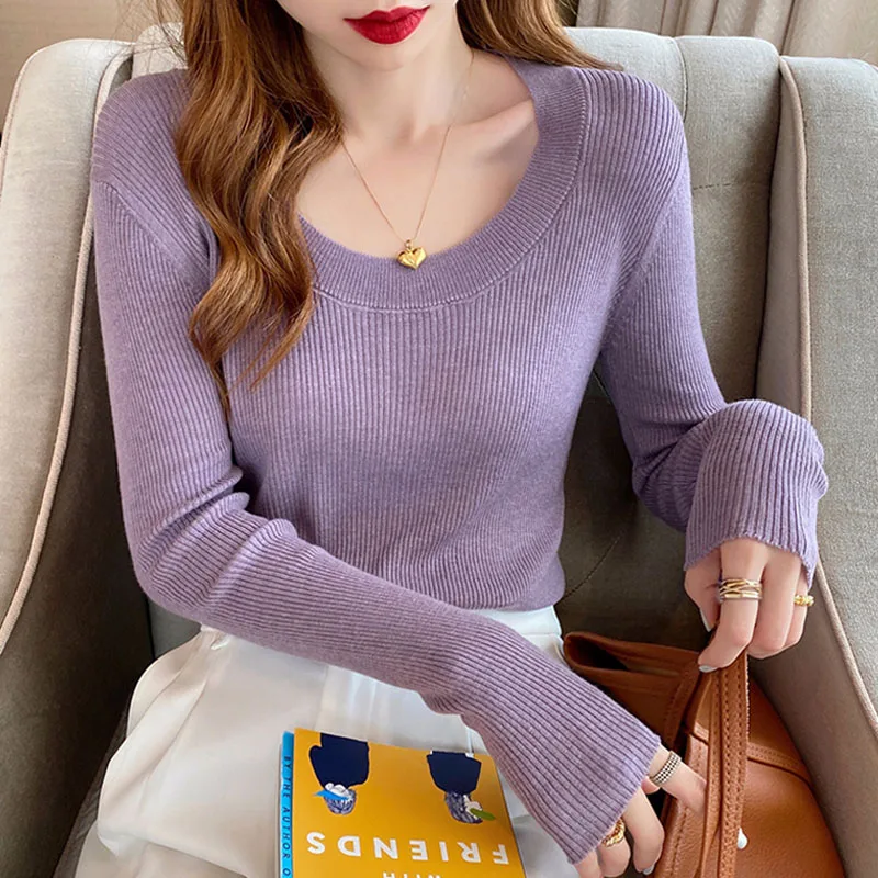 Женский трикотажный пуловер с круглым вырезом и длинным рукавом