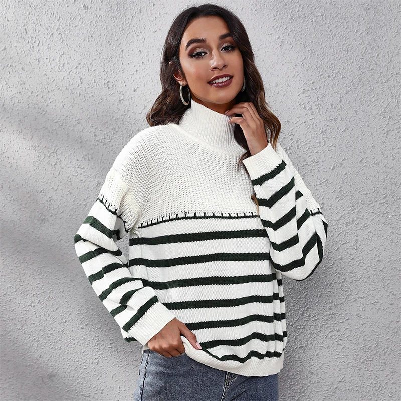 Женский трикотажный свитер-водолазка в полоску, с длинным рукавом