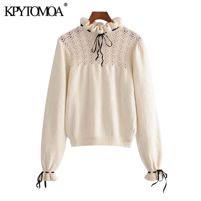 Женский трикотажный свитер с бантом KPYTOMOA, винтажный пуловер с высоким воротником и длинным рукавом, шикарные топы, 2021