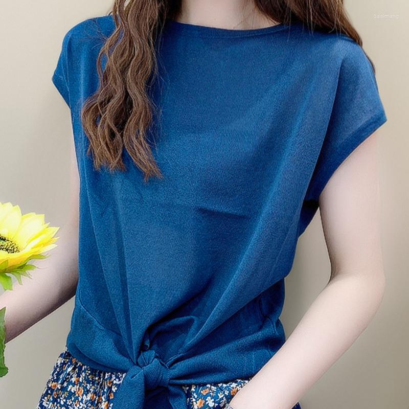 Women's T Shirts Lace Up Bow Ice Silk Shirt Women Knitted Tops Mujer Summer Thin T-Shirts Woman Clothes Casual Loose Sleeveless Tee Femme, Black