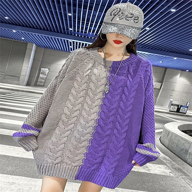 Женский трикотажный свитер с круглым вырезом и контрастной вставкой