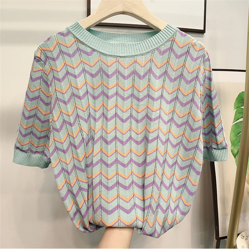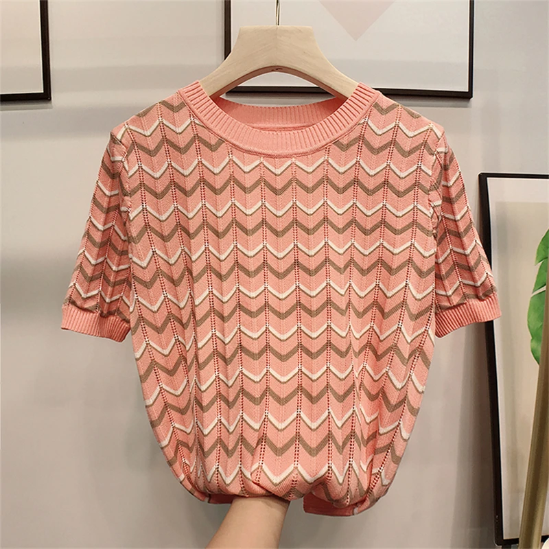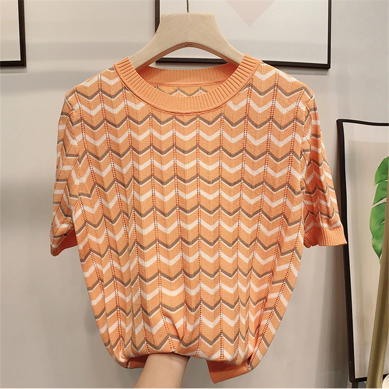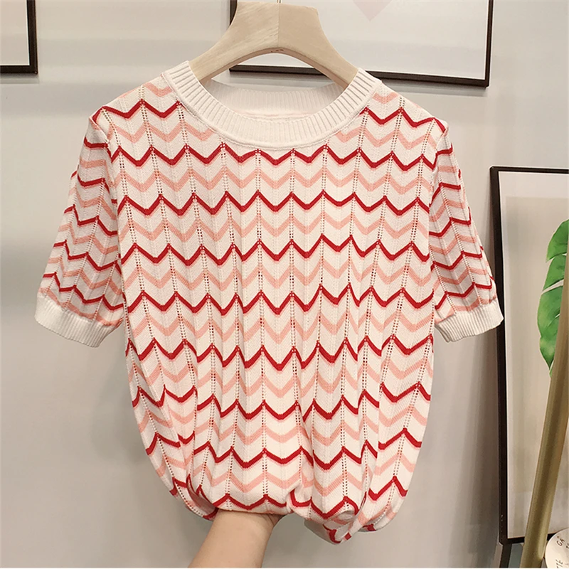 Женский трикотажный топ в полоску, с коротким рукавом и круглым вырезом