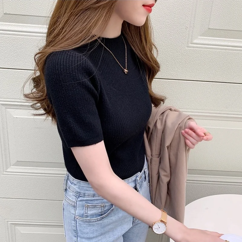 Женский трикотажный топ с коротким рукавом и круглым вырезом