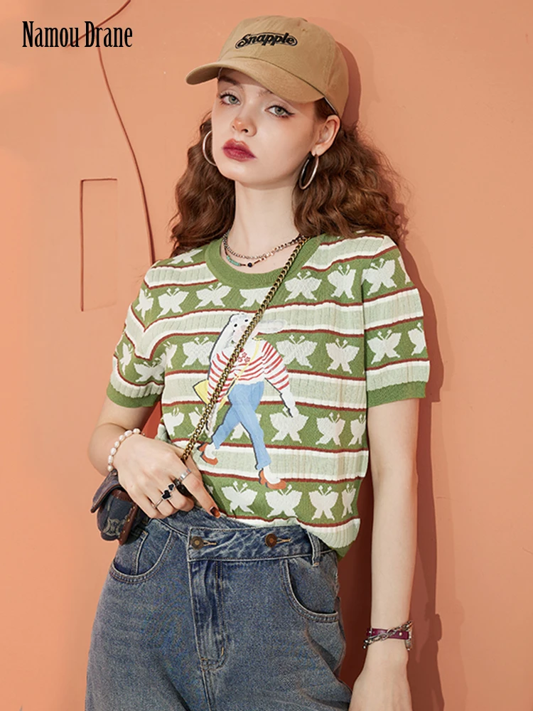 Женский трикотажный топ с коротким рукавом Namou Drane, летний облегающий топ из имитации льна в полоску, 2022