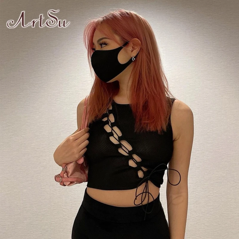 Женский укороченный топ без рукавов ArtSu, черный ажурный топ в рубчик, осенняя модная сексуальная майка, уличная одежда, VE52520