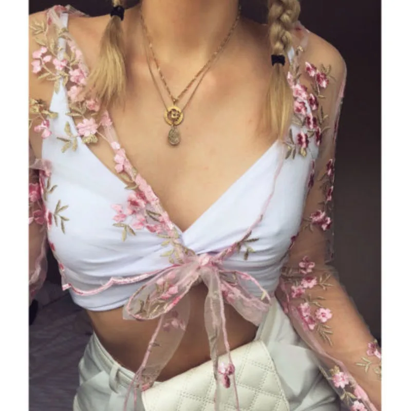 Женский укороченный топ с вышивкой, прозрачный сетчатый топ с длинным рукавом, Клубная одежда, повседневный облегающий топ на шнуровке