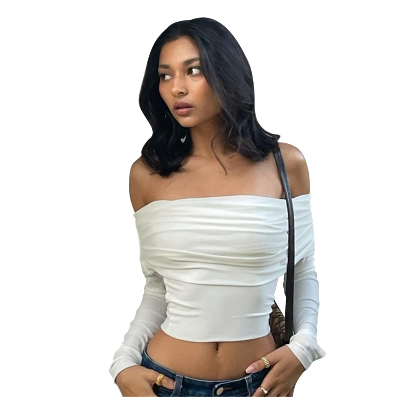 Женский укороченный топ с открытыми плечами и длинным рукавом