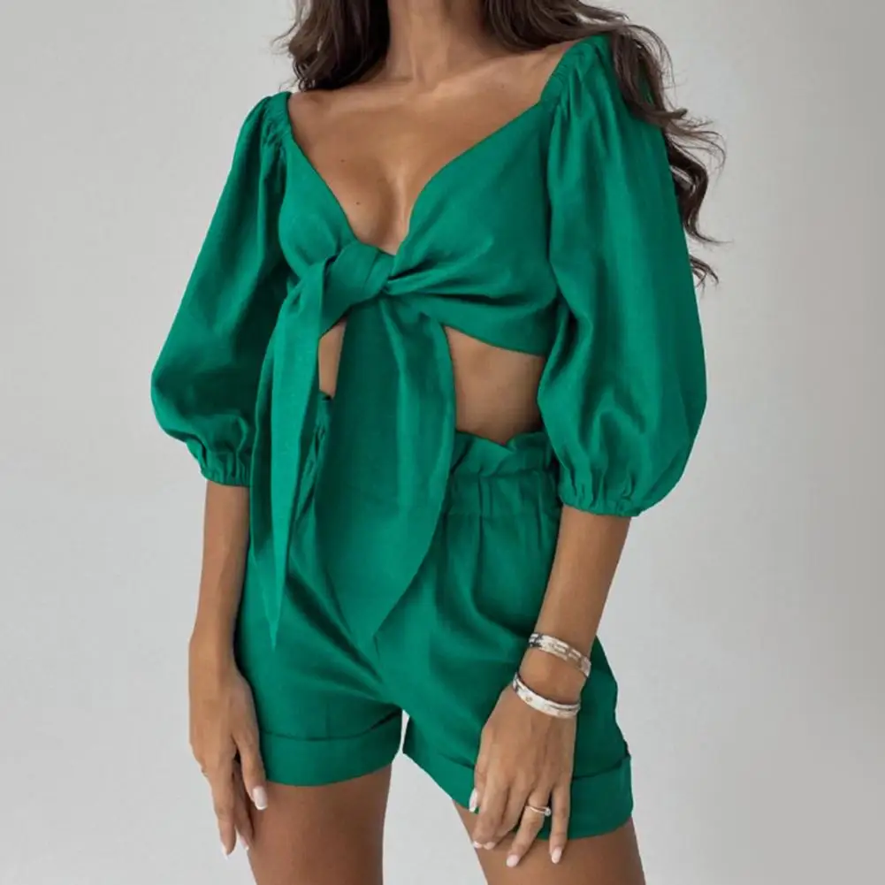 Женский хлопковый костюм из 2 предметов, однотонный топ с V-образным вырезом, открытыми плечами и открытой спиной, короткий топ на шнуровке, ш...
