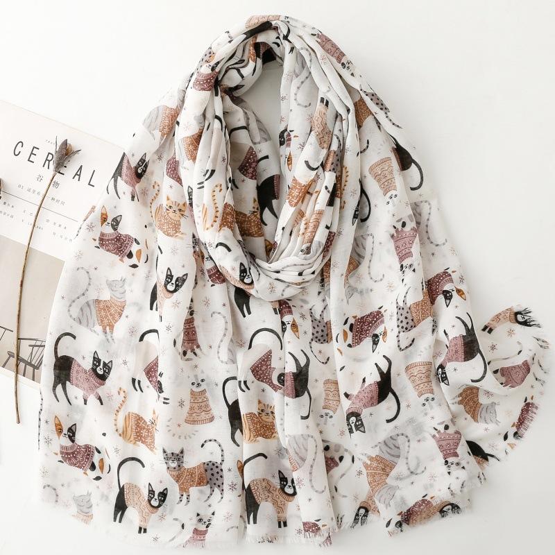 Женский шарф с принтом в виде кошек в стиле бохо - легкая дышащая шаль и повязка на шею, мягкие пастельные тона с черно-белыми рисунками кошек 180*88CM