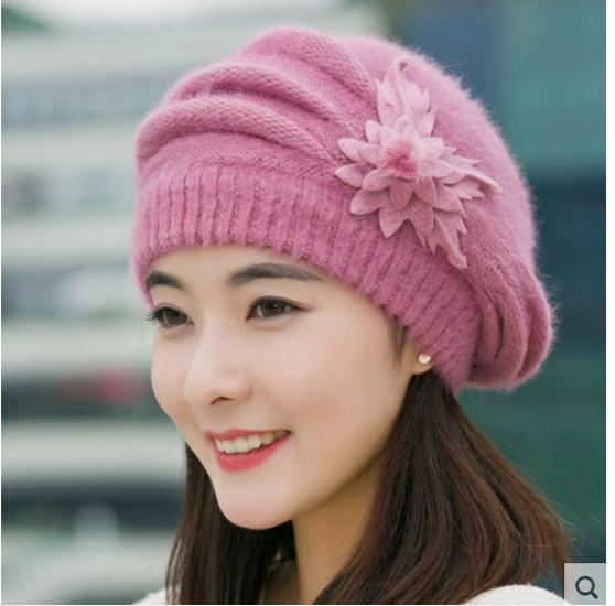 Женский шерстяной берет в корейском стиле с цветочным узором - Теплая вязаная шапка из кроличьего пуха для осени/зимы L (58-60cm)