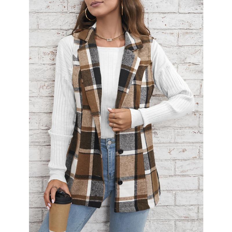 Женский элегантный однобортный разноцветный клетчатый жилет с лацканами на весну и осень XL коричневый