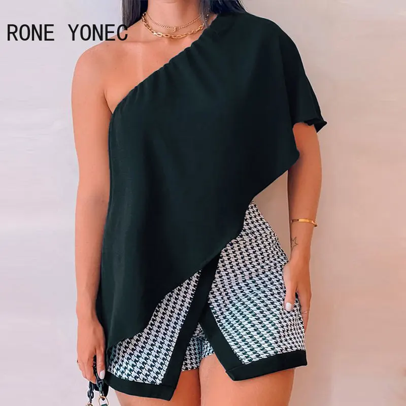 Женский элегантный однотонный топ с диагональным воротником и оборками и асимметричный короткий комплект с узором «гусиные лапки», 2023