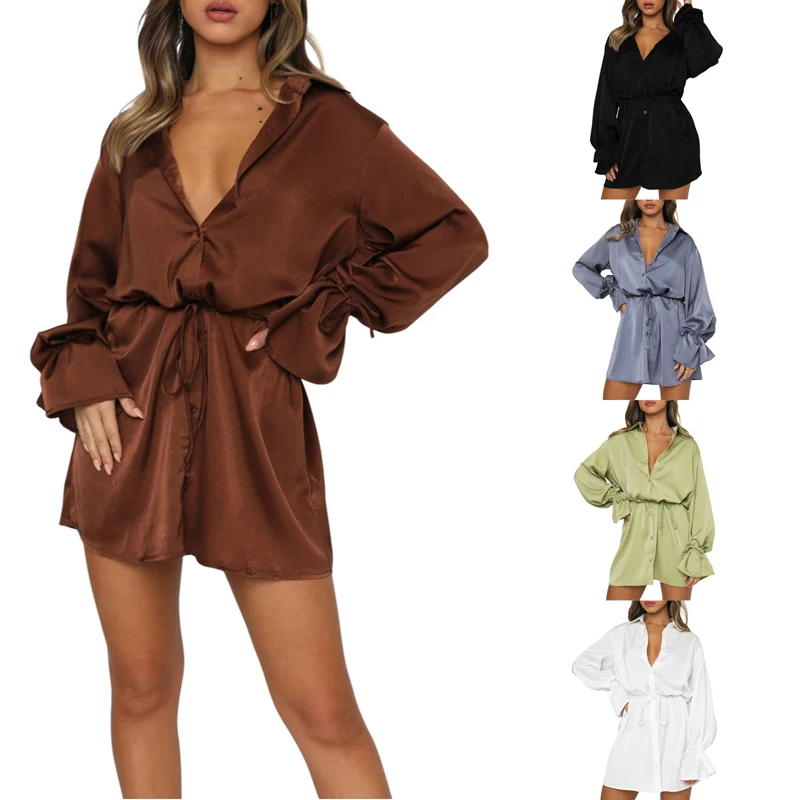 Женское Деловое платье-рубашка с лацканами и расклешенными рукавами