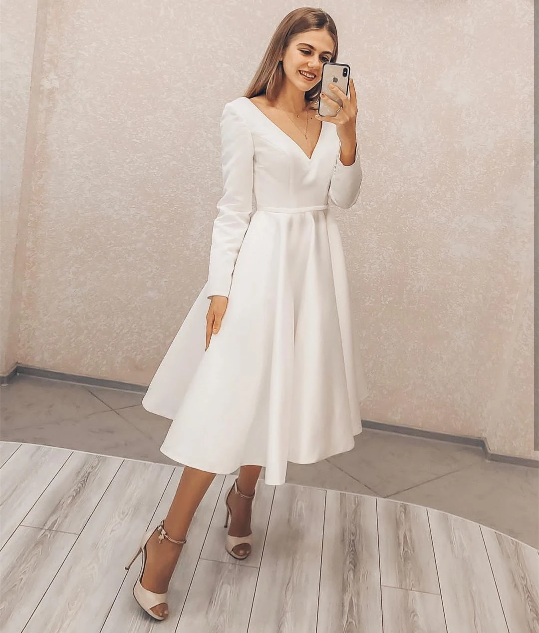 Женское Короткое свадебное платье, простое винтажное платье А-силуэта с длинным рукавом и V-образным вырезом в стиле бохо, платье невесты, 2024